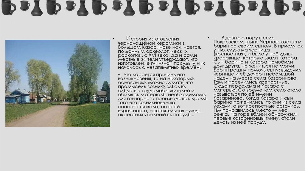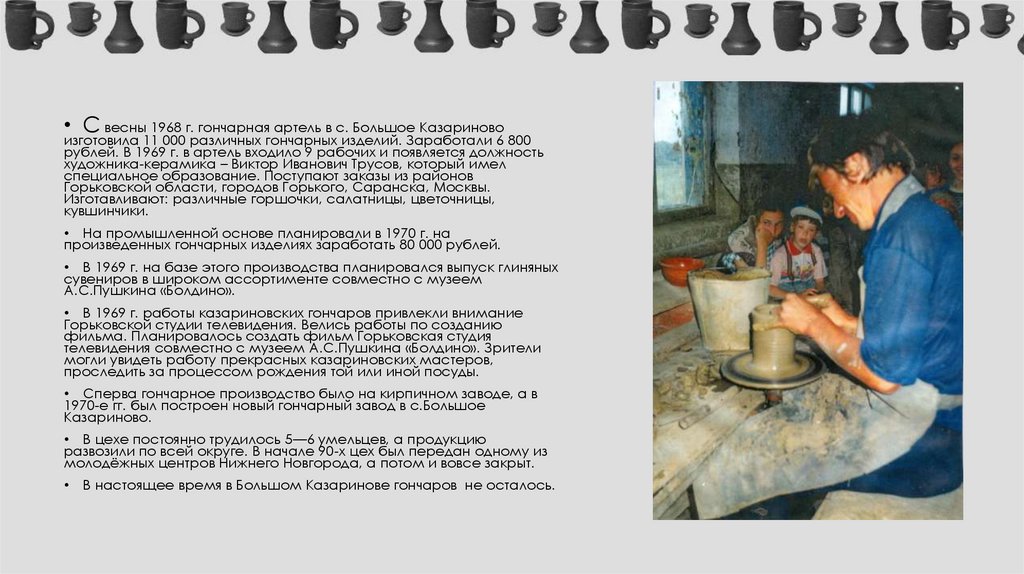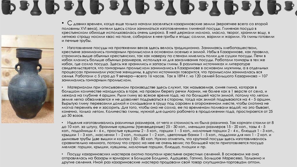 • Посуду казариновских мастеров охотно покупали крестьяне окрестных селений. В основном же она