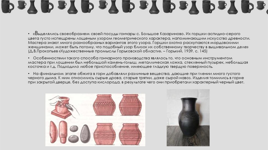 • «Выделялись своеобразием своей посуды гончары с. Большое Казариново. Их горшки аспидно-серогоцвета густо испещрены лощеным узором геометрического характера, напоминающим искусство древности.