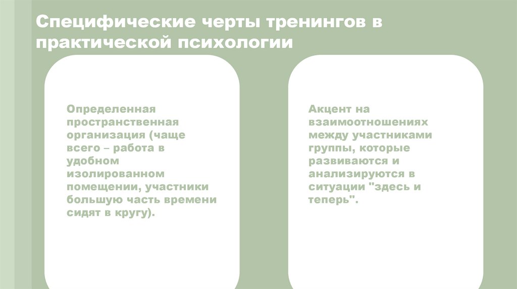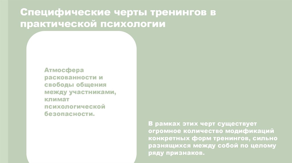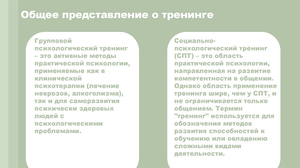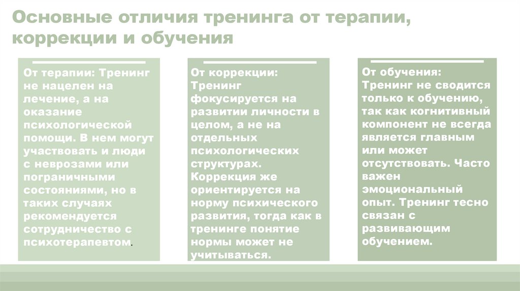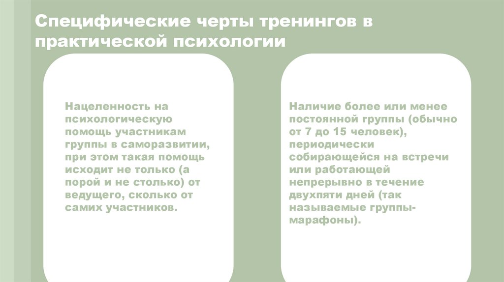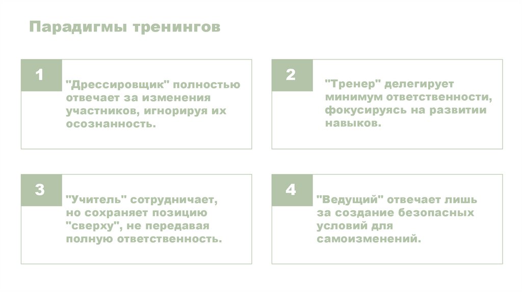 Разнообразие названий специалистов (тренер, фасилитатор и др.)отражает разное понимание сути тренинга. Часто тренинги