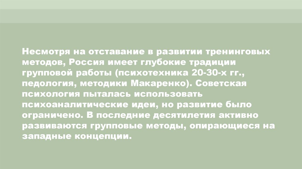 Несмотря на отставание в развитии тренинговыхметодов, Россия имеет глубокие традиции