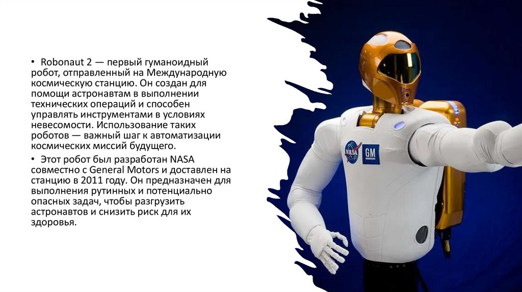 • Robonaut 2 — первый гуманоидныйробот, отправленный на Международную