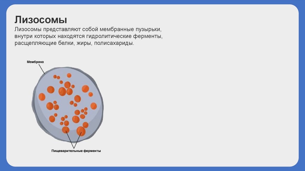 ЛизосомыЛизосомы представляют собой мембранные пузырьки,