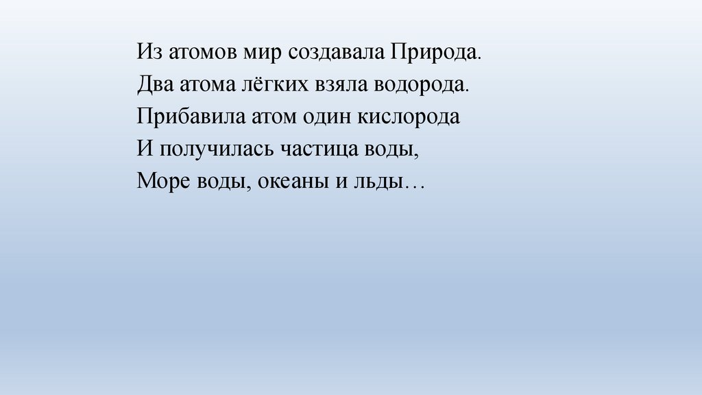 Из атомов мир создавала Природа.Два атома лёгких взяла водорода.