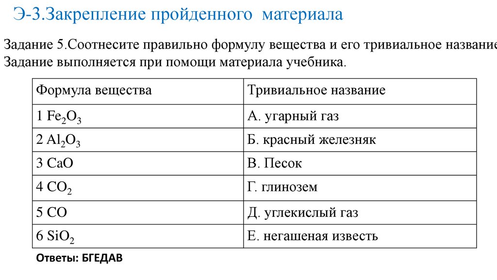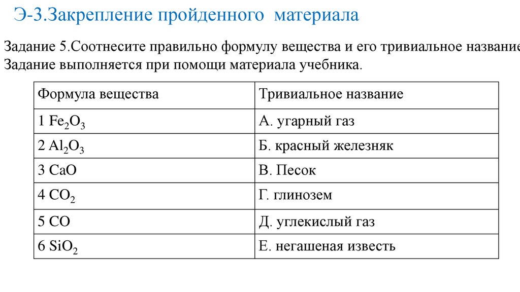 Э-3.Закрепление пройденного материалаЗадание 5.Соотнесите правильно формулу вещества и его тривиальное название