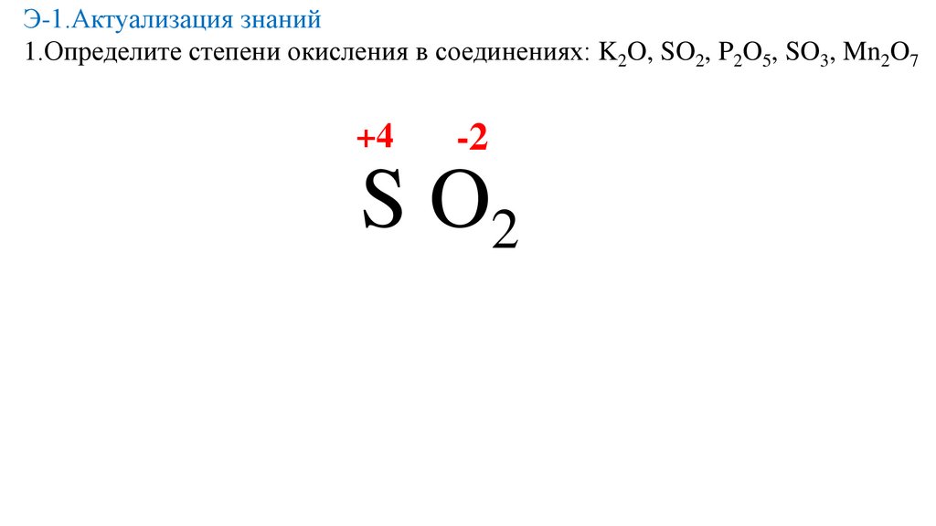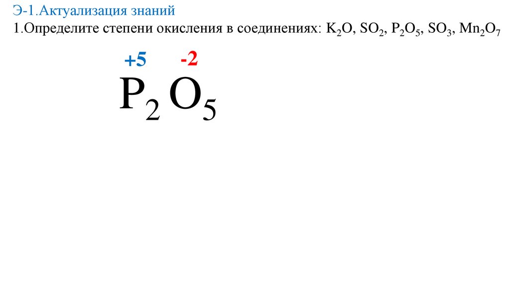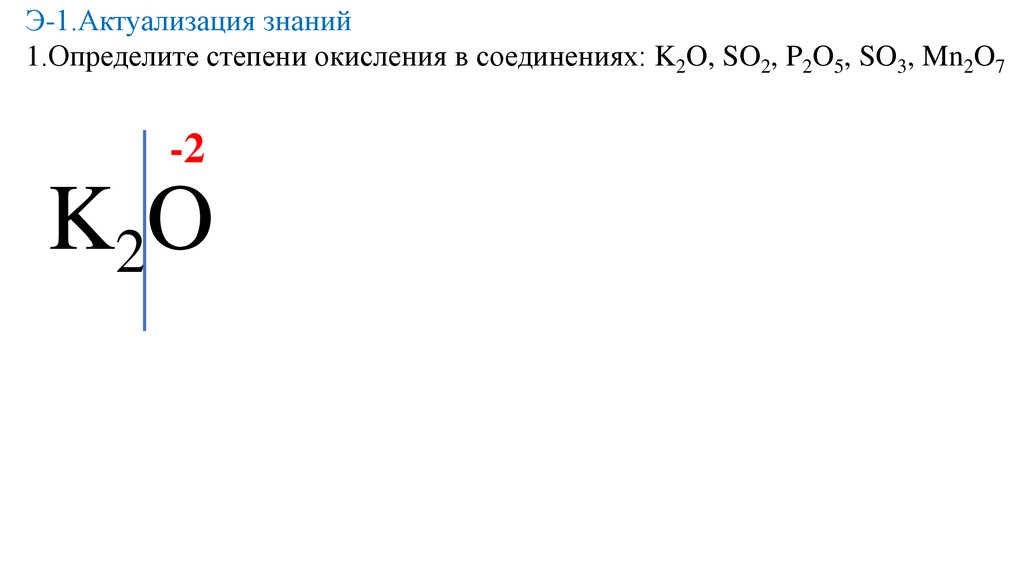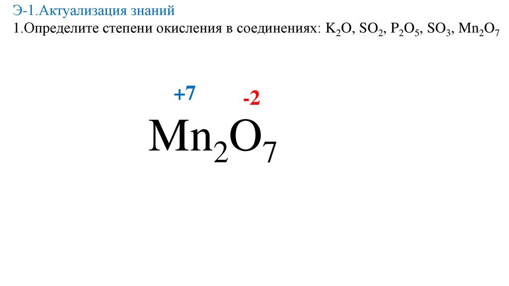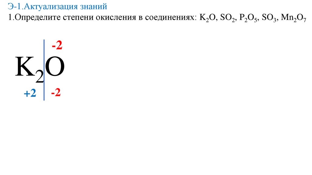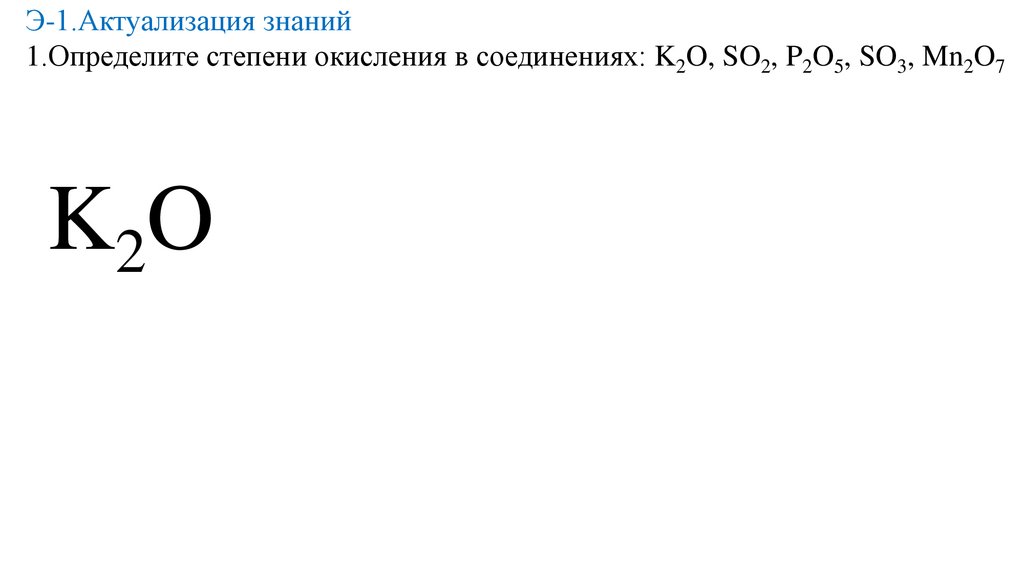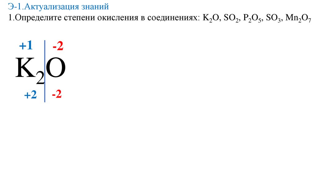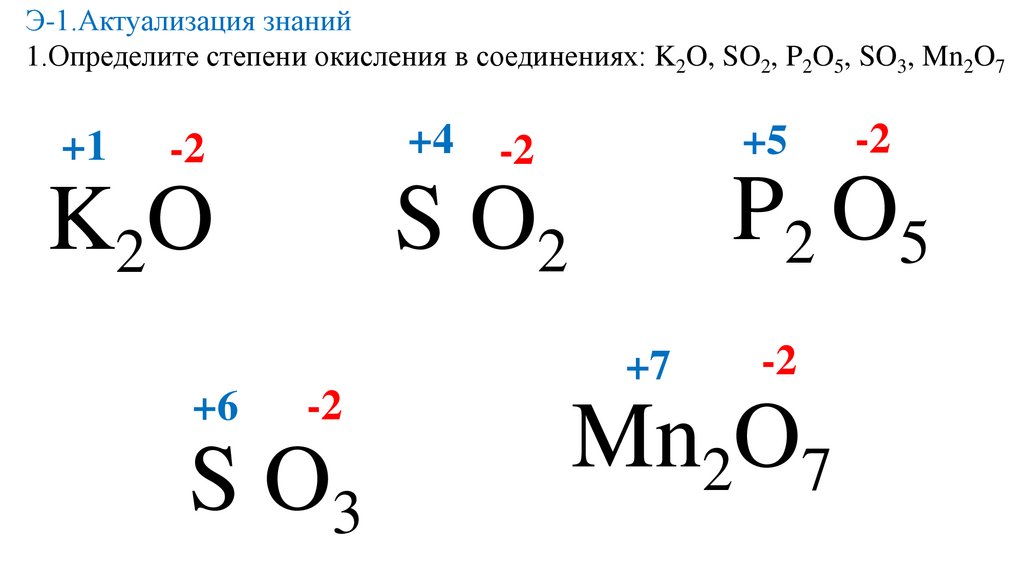 Э-1.Актуализация знаний1.Определите степени окисления в соединениях: K2O, SO2, P2O5, SO3, Mn2O7