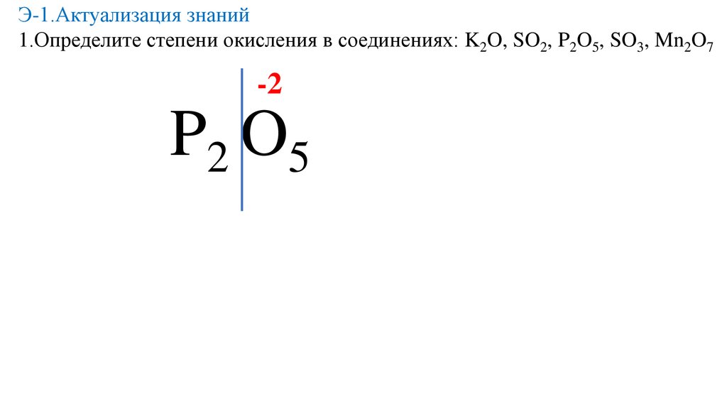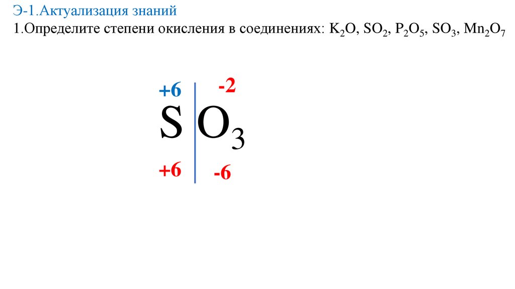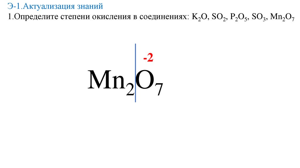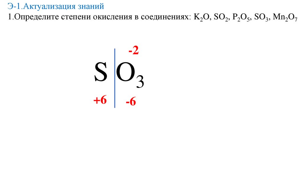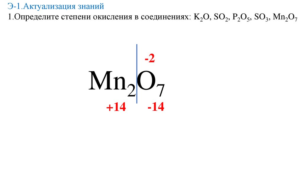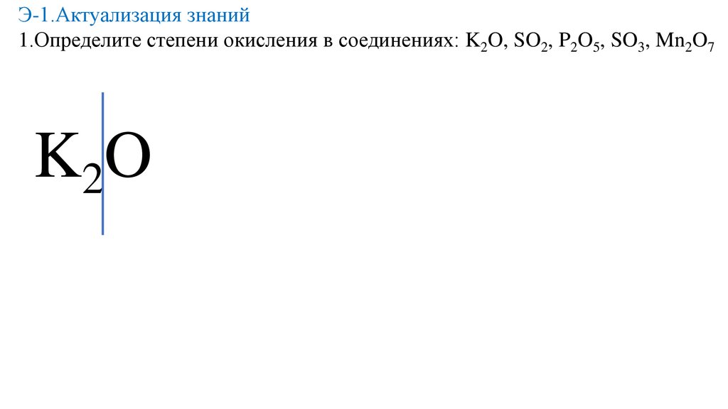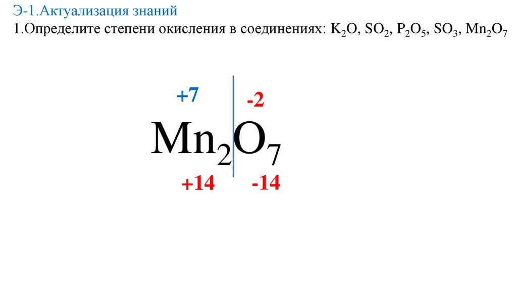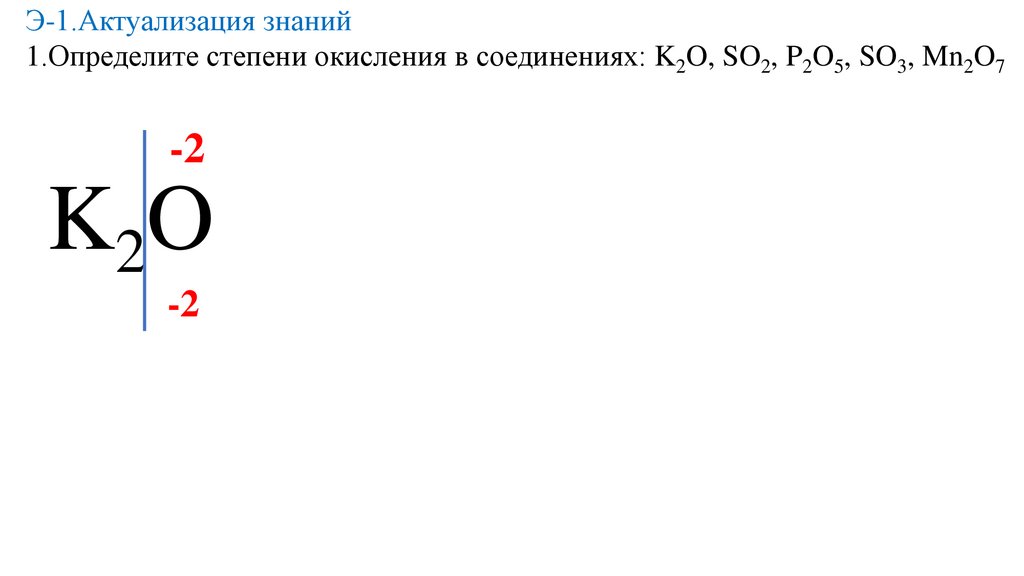 Э-1.Актуализация знаний1.Определите степени окисления в соединениях: K2O, SO2, P2O5, SO3, Mn2O7