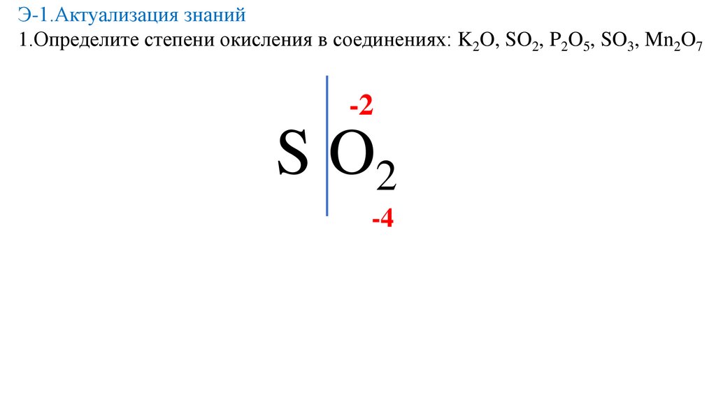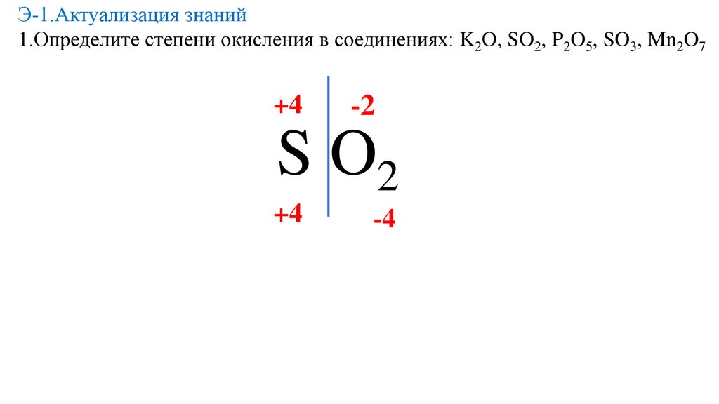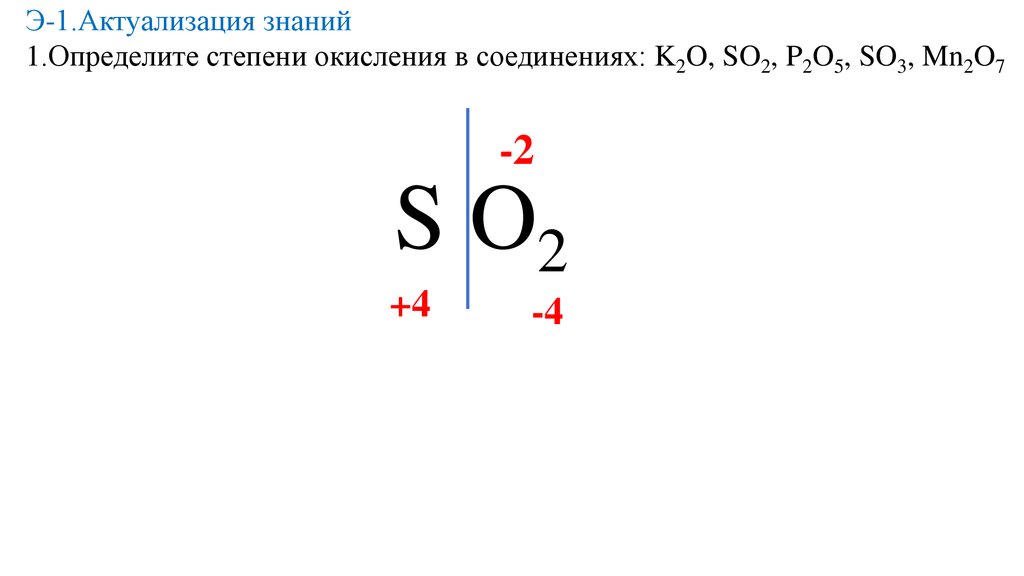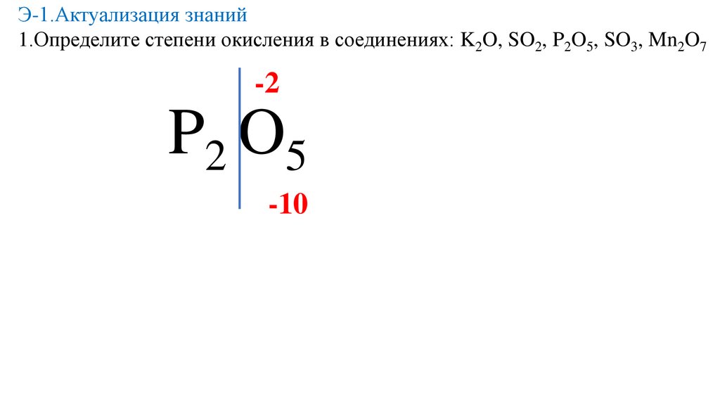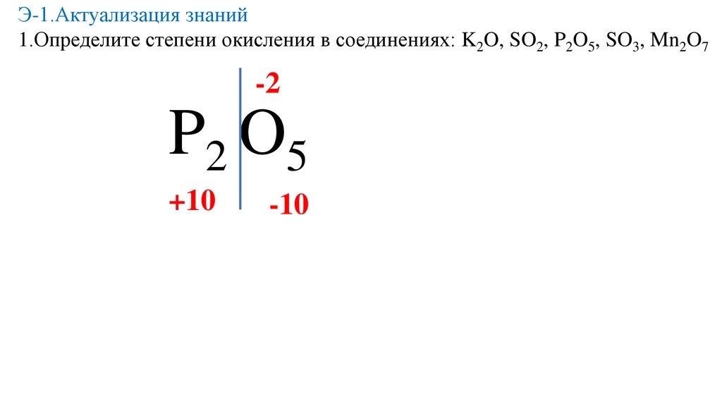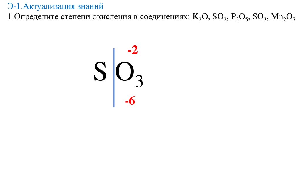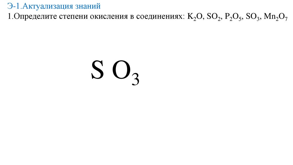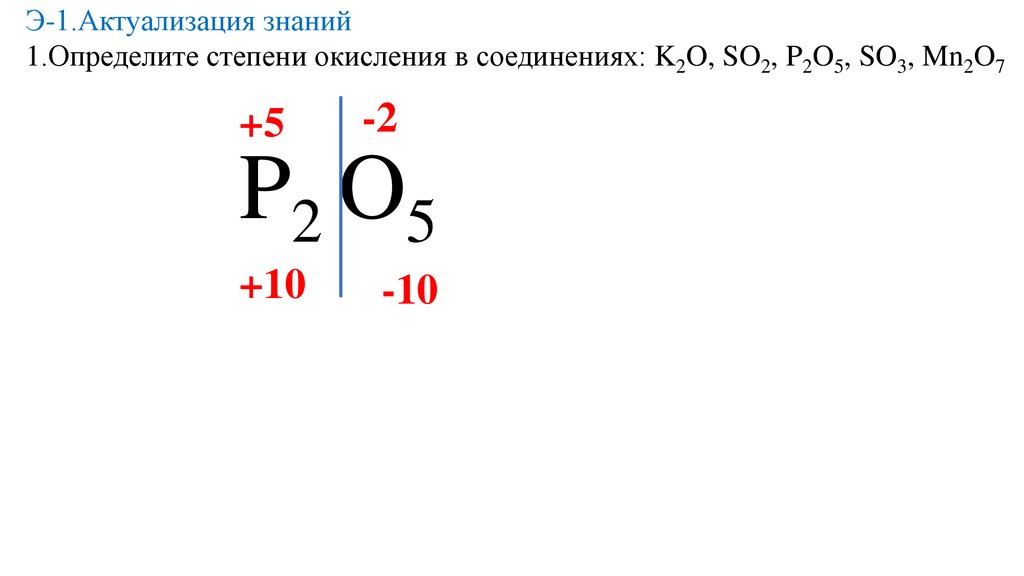 Э-1.Актуализация знаний1.Определите степени окисления в соединениях: K2O, SO2, P2O5, SO3, Mn2O7