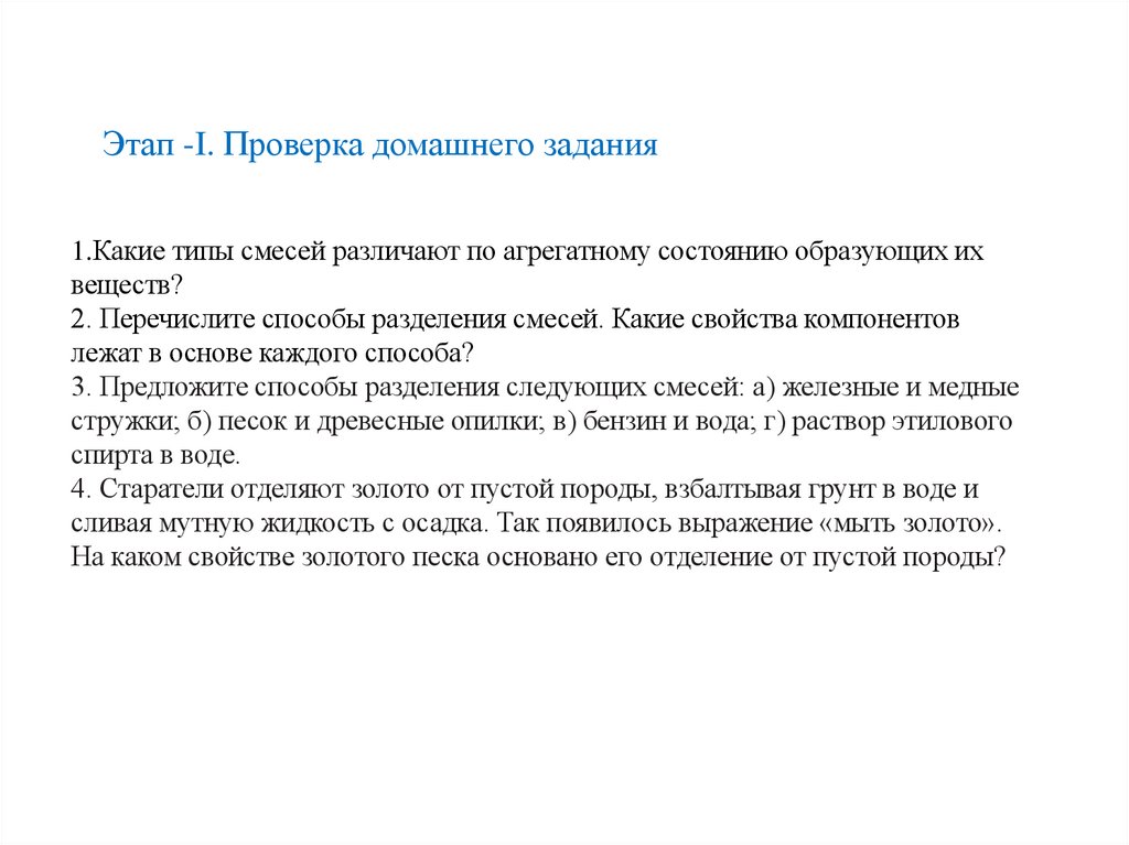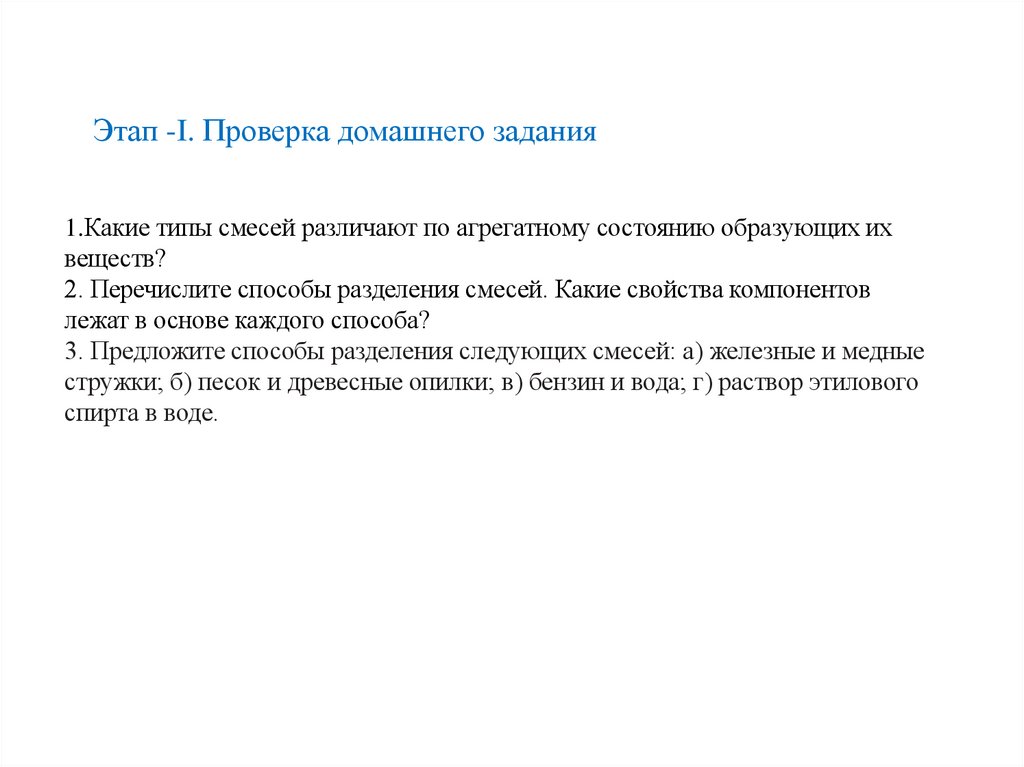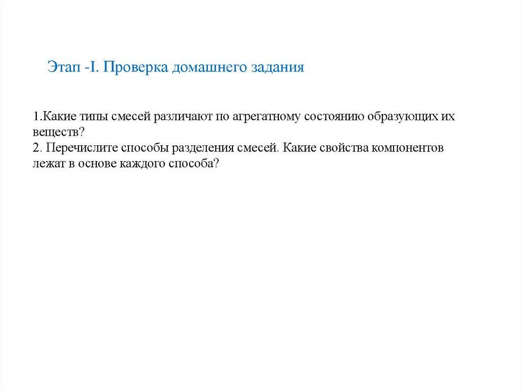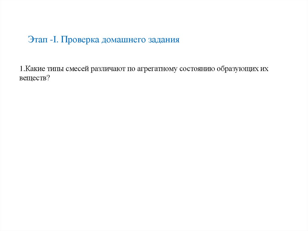 Этап -I. Проверка домашнего задания1.Какие типы смесей различают по агрегатному состоянию образующих их