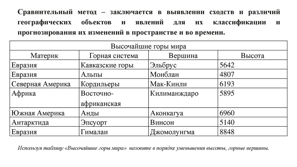 Используя таблицу «Высочайшие горы мира» назовите в порядке уменьшения высоты, горные вершины.