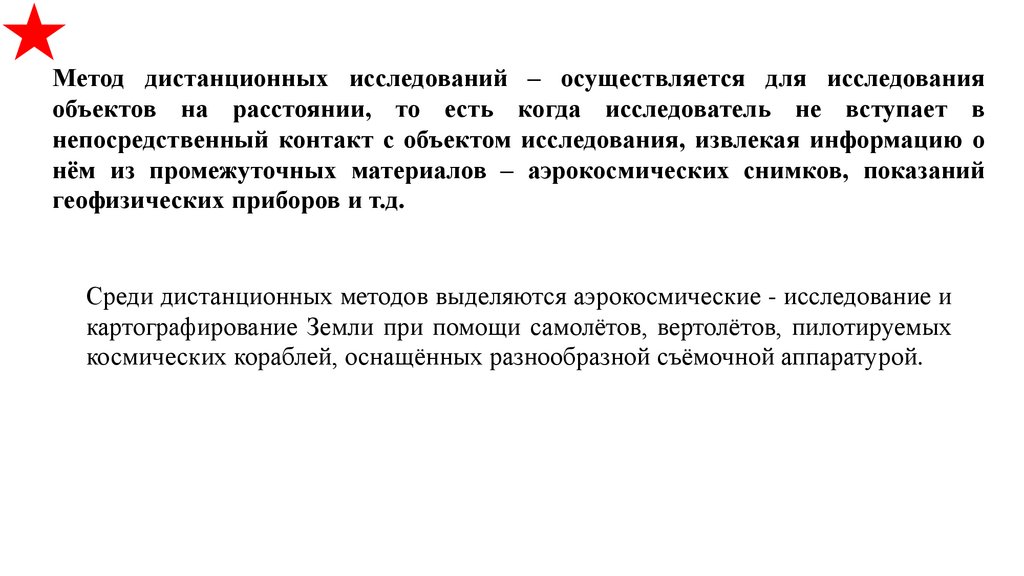 Среди дистанционных методов выделяются аэрокосмические - исследование и