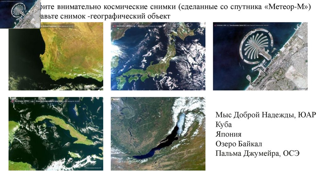 Рассмотрите внимательно космические снимки (сделанные со спутника «Метеор-М»)о сопоставьте снимок -географический объект