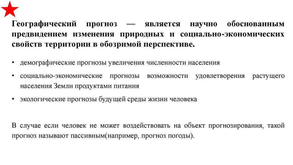 Географический прогноз — является научно обоснованнымпредвидением изменения природных и социально-экономических