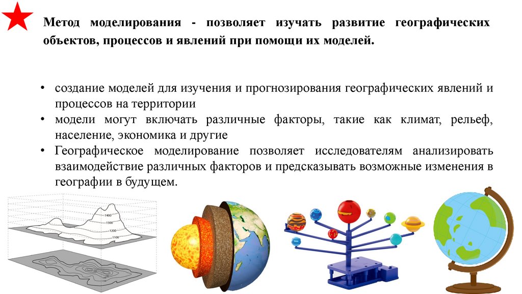 Метод моделирования - позволяет изучать развитие географическихобъектов, процессов и явлений при помощи их моделей.