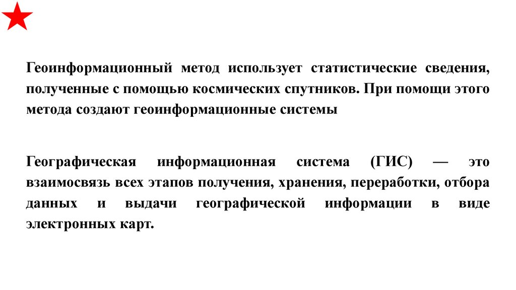 Геоинформационный метод использует статистические сведения,полученные с помощью космических спутников. При помощи этого