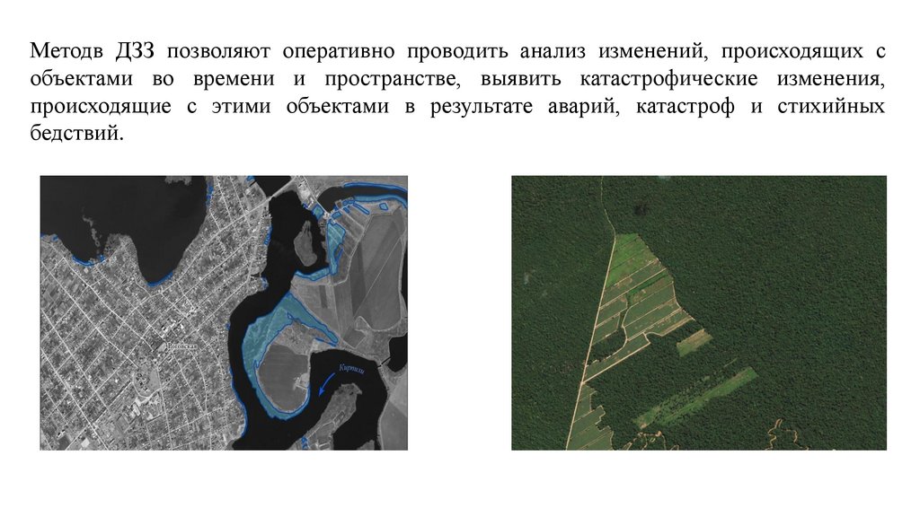Методв ДЗЗ позволяют оперативно проводить анализ изменений, происходящих собъектами во времени и пространстве, выявить катастрофические изменения,
