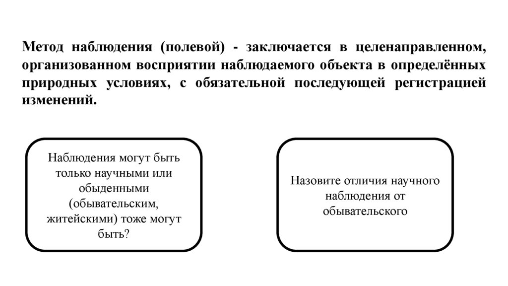 Метод наблюдения (полевой) - заключается в целенаправленном,организованном восприятии наблюдаемого объекта в определённых