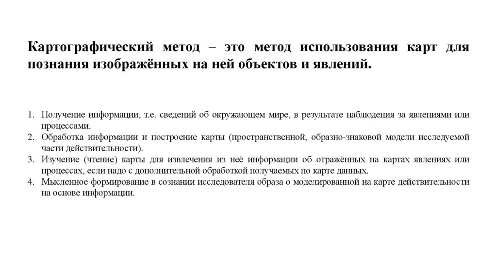 Картографический метод – это метод использования карт дляпознания изображённых на ней объектов и явлений.