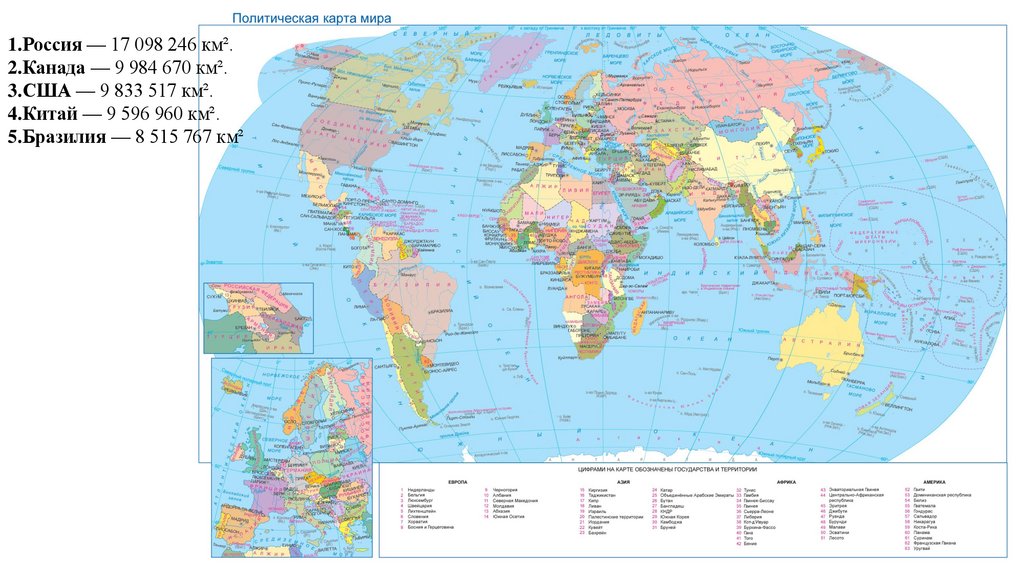 1.Россия — 17 098 246 км².2.Канада — 9 984 670 км².