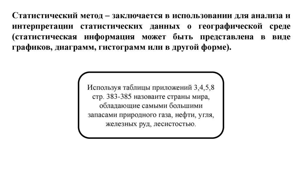 Статистический метод – заключается в использовании для анализа иинтерпретации статистических данных о географической среде