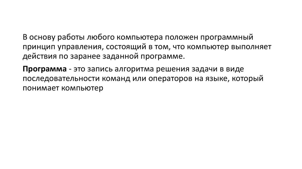 В основу работы любого компьютера положен программныйпринцип управления, состоящий в том, что компьютер выполняет