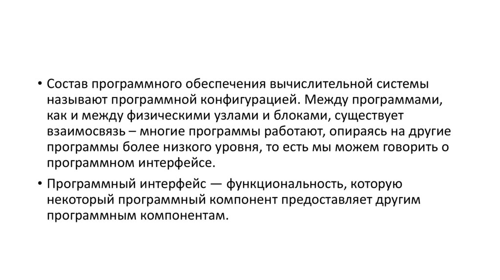• Состав программного обеспечения вычислительной системыназывают программной конфигурацией. Между программами,