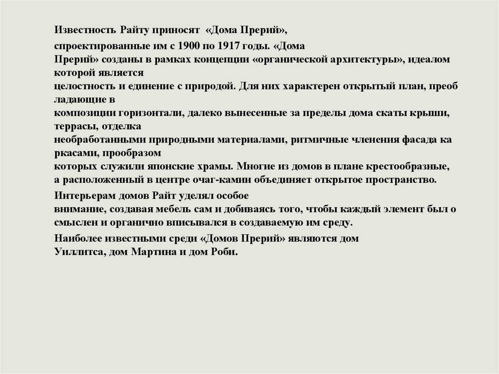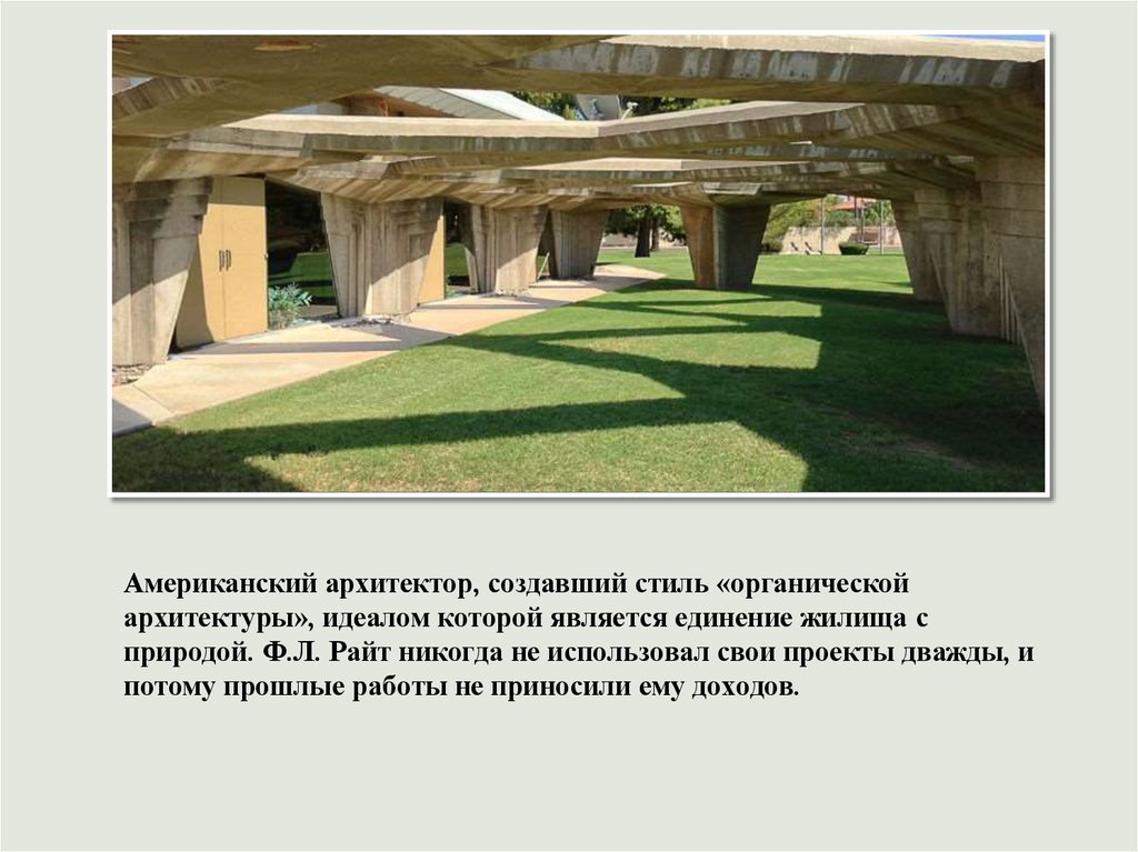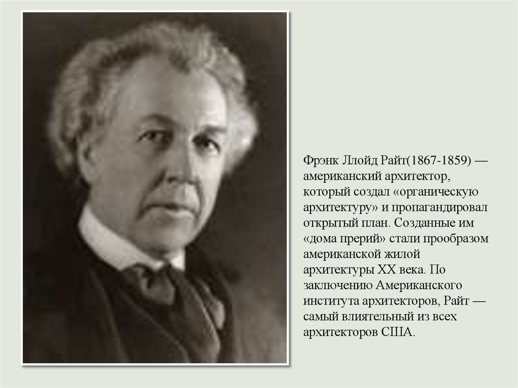 Американский архитектор, создавший стиль «органическойархитектуры», идеалом которой является единение жилища с