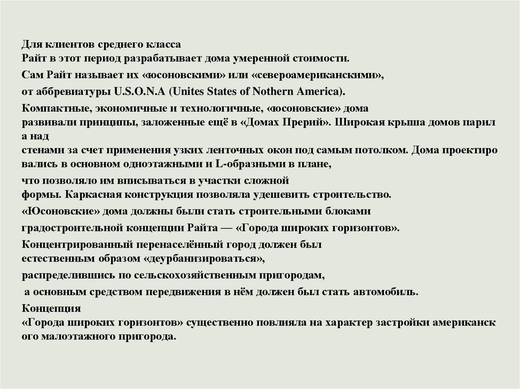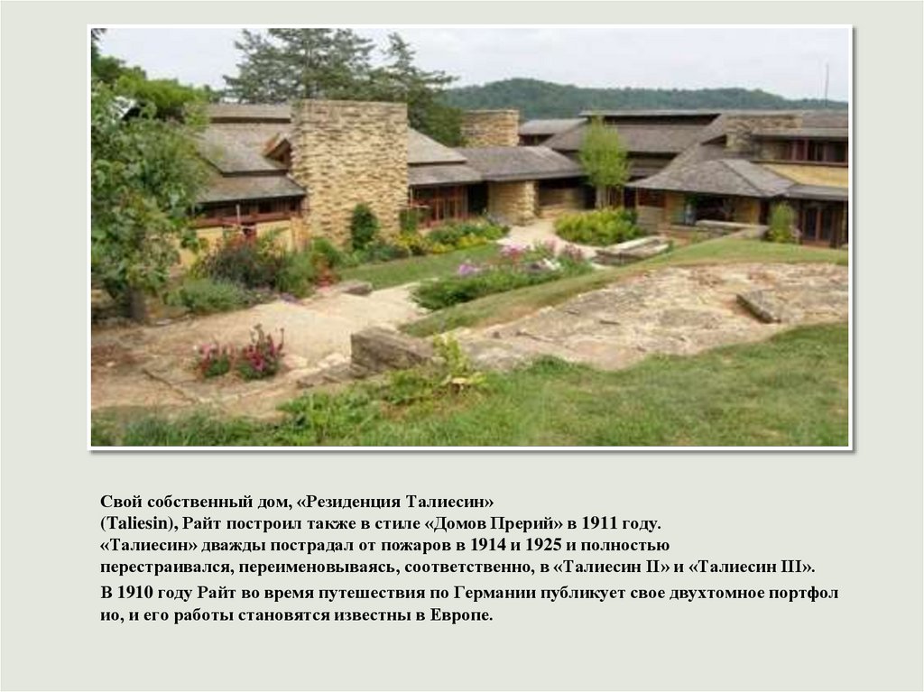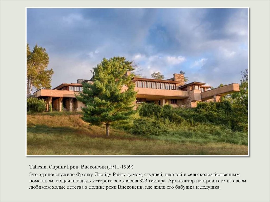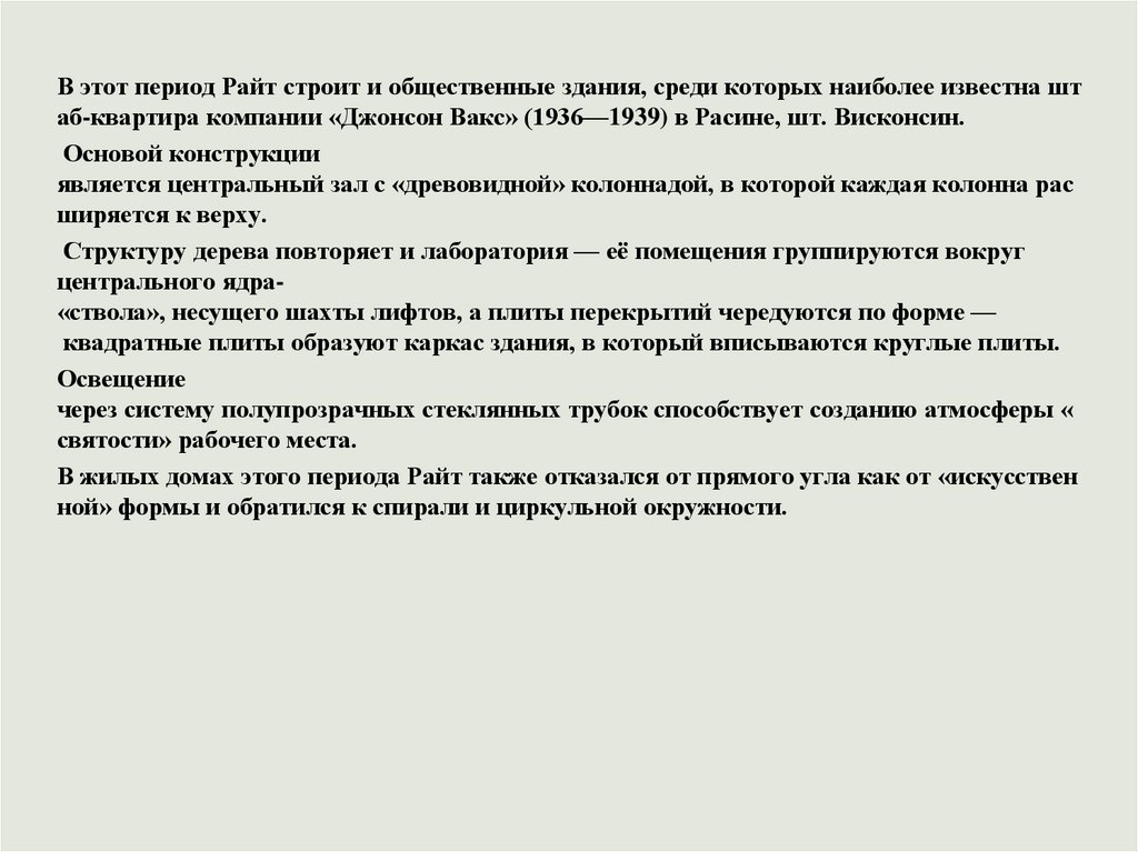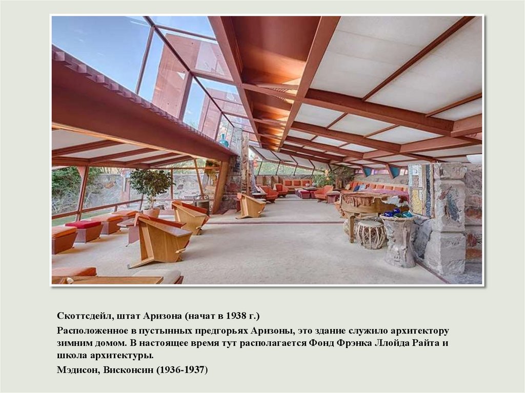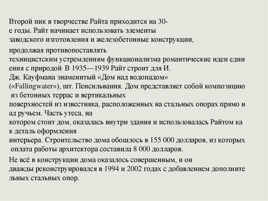 Второй пик в творчестве Райта приходится на 30е годы. Райт начинает использовать элементызаводского изготовления и железобетонные конструкции,