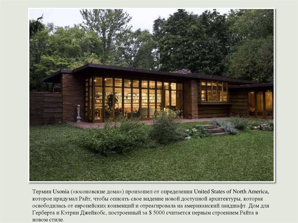 Термин Usonia («юсоновские дома») произошел от определения United States of North America,которое придумал Райт, чтобы описать свое видение новой доступной архитектуры, которая