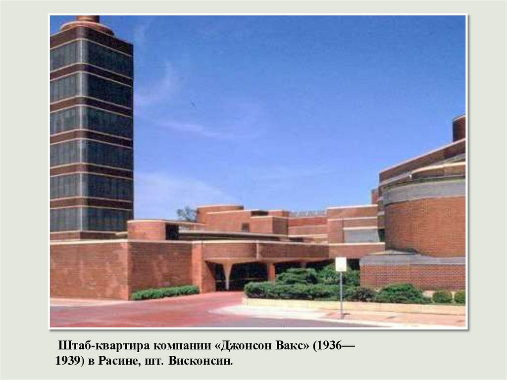 В этот период Райт строит и общественные здания, среди которых наиболее известна штаб-квартира компании «Джонсон Вакс» (1936—1939) в Расине, шт. Висконсин.