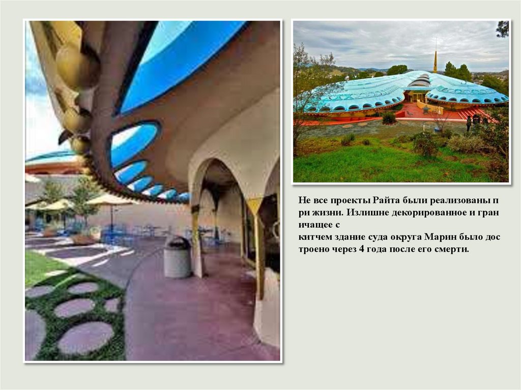 Не все проекты Райта были реализованы при жизни. Излишне декорированное и гран