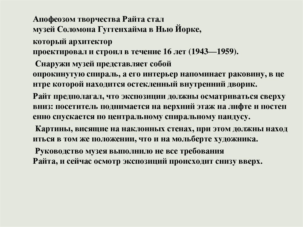Апофеозом творчества Райта сталмузей Соломона Гуггенхайма в Нью Йорке,