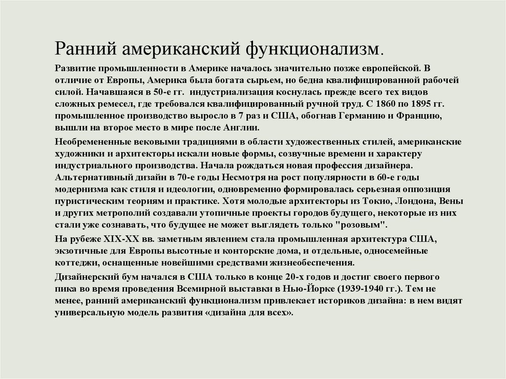 Ранний американский функционализм.Развитие промышленности в Америке началось значительно позже европейской. В