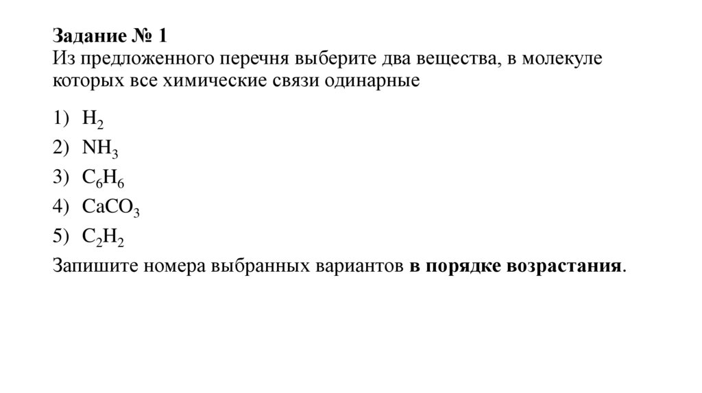 1. Задание № 1 Из предложенного перечня выберите два вещества, в молекуле которых все химические связи одинарные