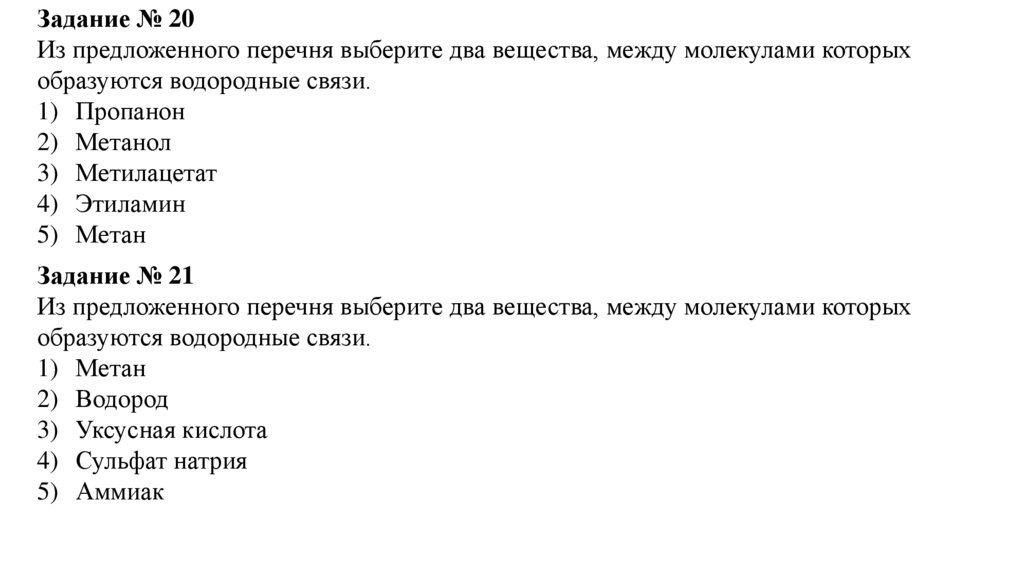 Задание № 20Из предложенного перечня выберите два вещества, между молекулами которых