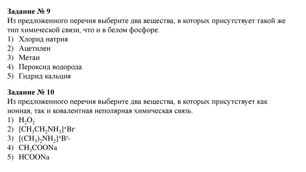 Задание № 9Из предложенного перечня выберите два вещества, в которых присутствует такой же