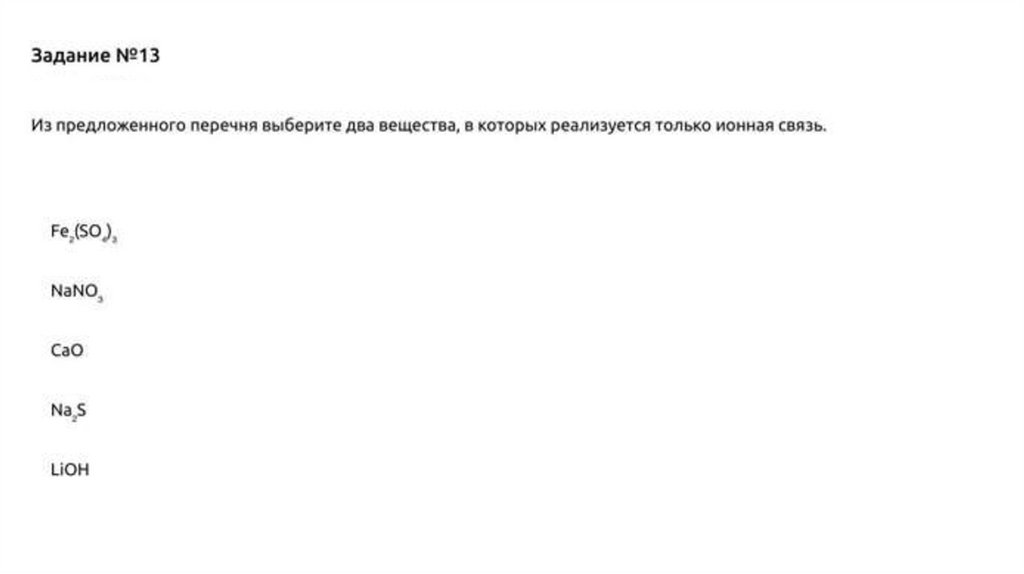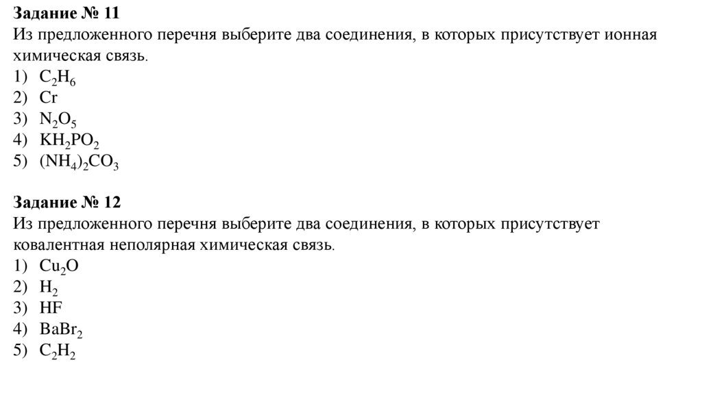 Задание № 11Из предложенного перечня выберите два соединения, в которых присутствует ионная