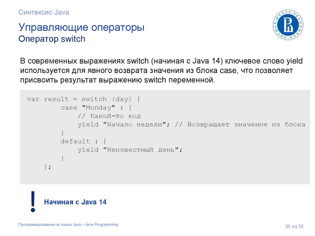 В современных выражениях switch (начиная с Java 14) ключевое слово yield