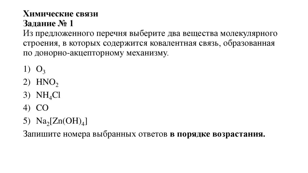1. Химические связи Задание № 1 Из предложенного перечня выберите два вещества молекулярного строения, в которых содержится