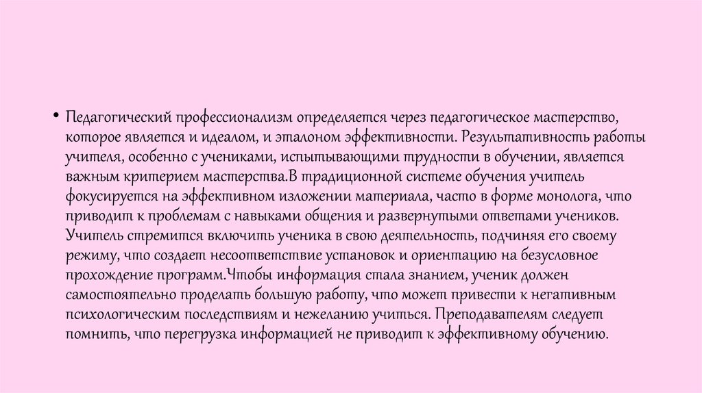 • Педагогический профессионализм определяется через педагогическое мастерство,которое является и идеалом, и эталоном эффективности. Результативность работы