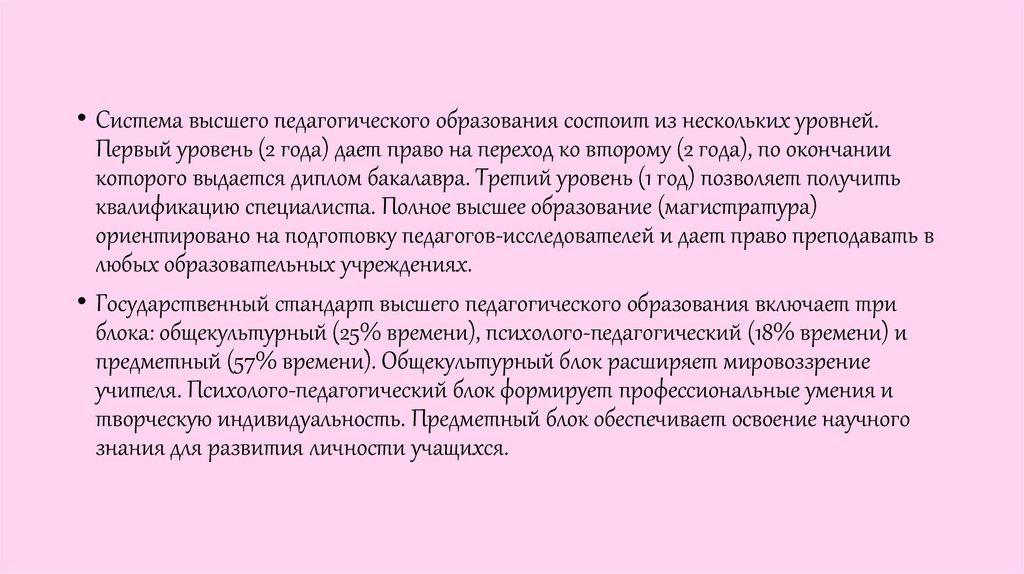 • Система высшего педагогического образования состоит из нескольких уровней.Первый уровень (2 года) дает право на переход ко второму (2 года), по окончании