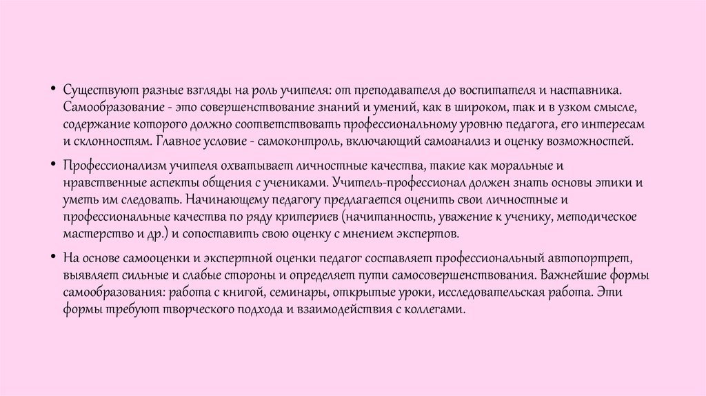 • Существуют разные взгляды на роль учителя: от преподавателя до воспитателя и наставника.Самообразование - это совершенствование знаний и умений, как в широком, так и в узком смысле,