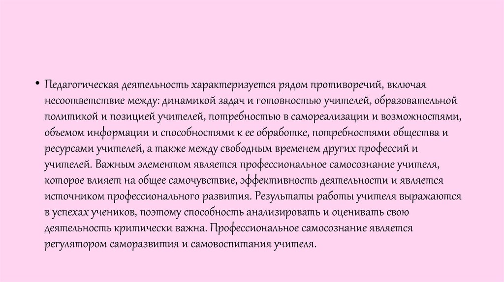 • Педагогическая деятельность характеризуется рядом противоречий, включаянесоответствие между: динамикой задач и готовностью учителей, образовательной