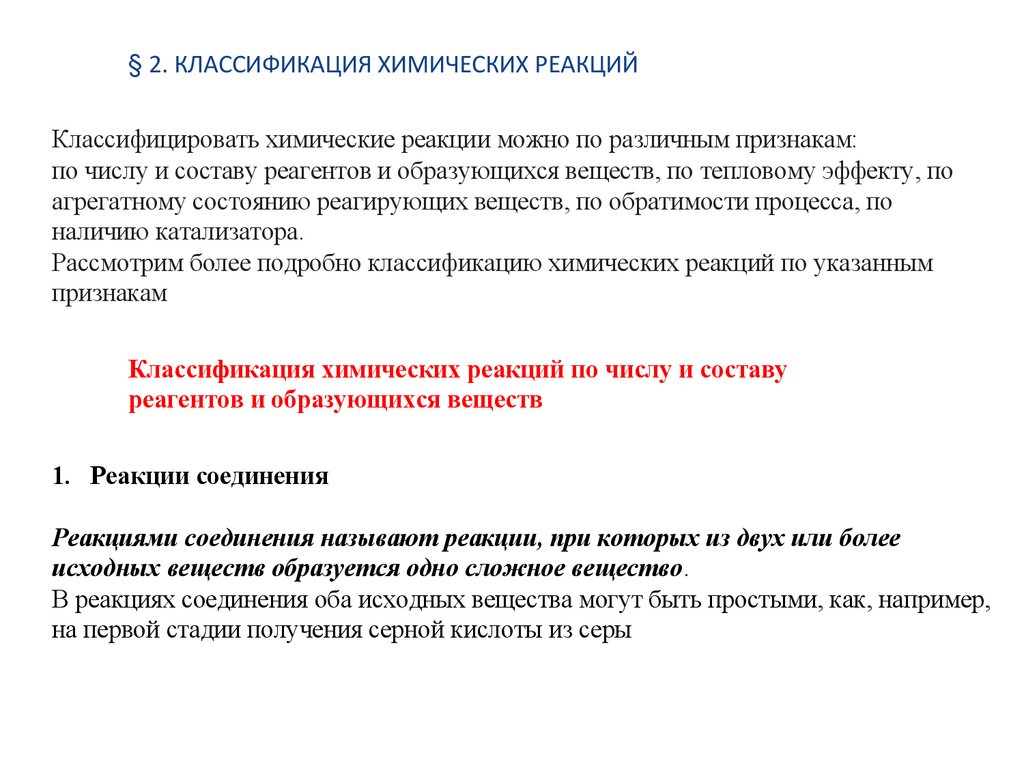 § 2. КЛАССИФИКАЦИЯ ХИМИЧЕСКИХ РЕАКЦИЙКлассифицировать химические реакции можно по различным признакам:
