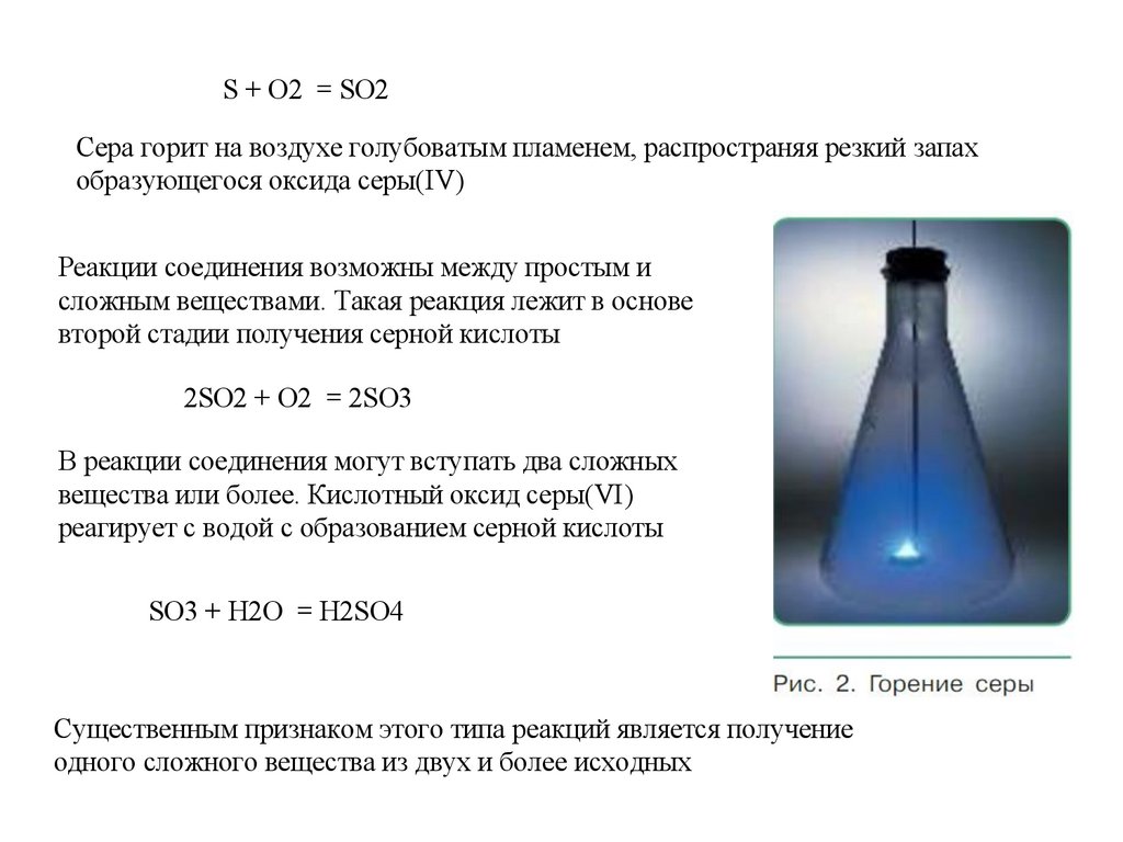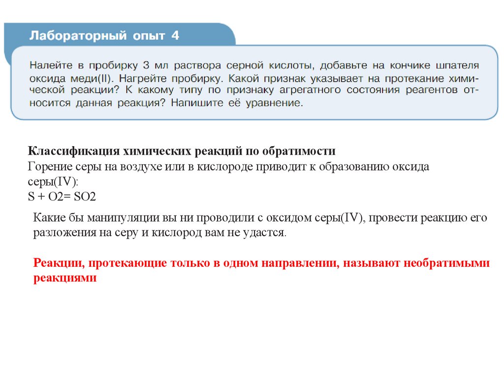 Классификация химических реакций по обратимостиГорение серы на воздухе или в кислороде приводит к образованию оксида