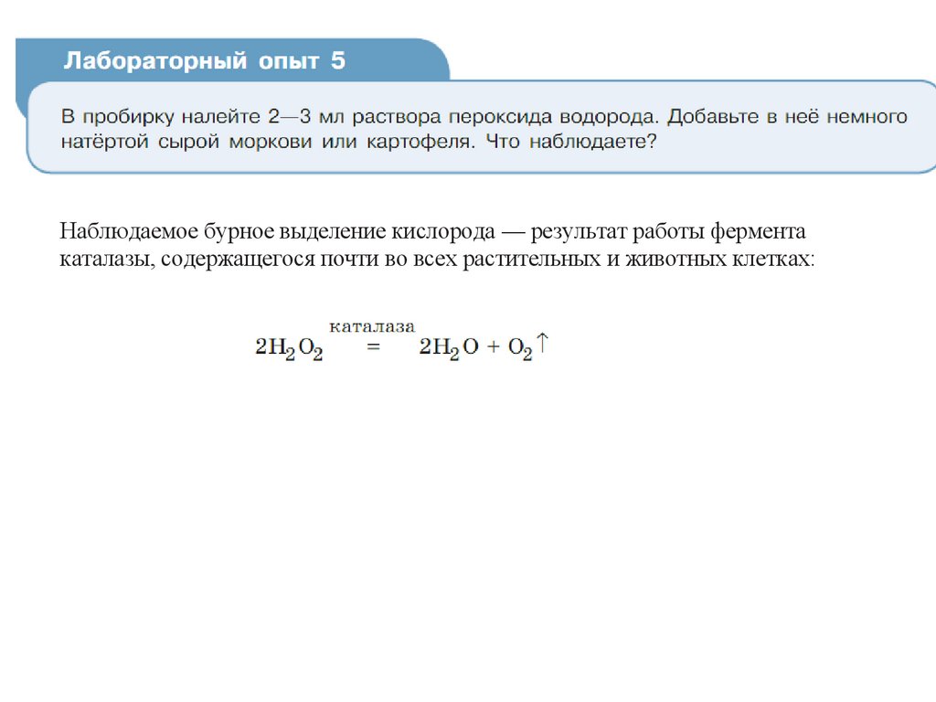 Наблюдаемое бурное выделение кислорода — результат работы ферментакаталазы, содержащегося почти во всех растительных и животных клетках: