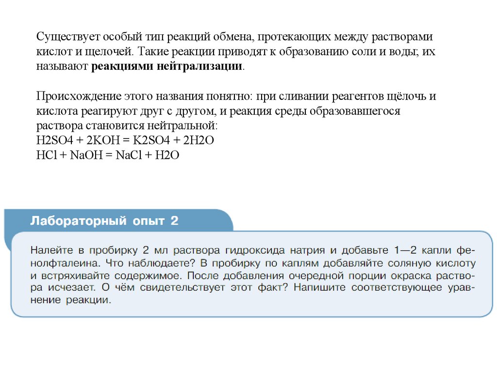 Существует особый тип реакций обмена, протекающих между растворамикислот и щелочей. Такие реакции приводят к образованию соли и воды; их