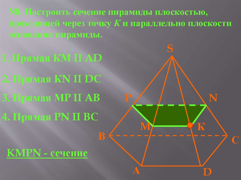 N8. Построить сечение пирамиды плоскостью,проходящей через точку К и параллельно плоскости