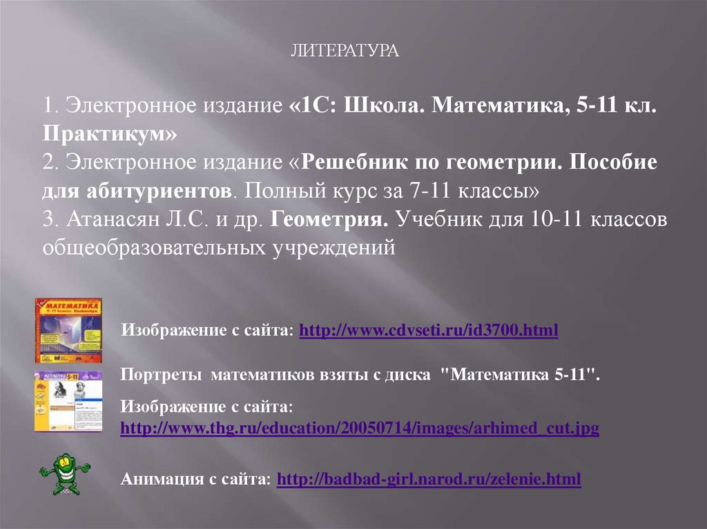 ЛИТЕРАТУРА1. Электронное издание «1С: Школа. Математика, 5-11 кл.