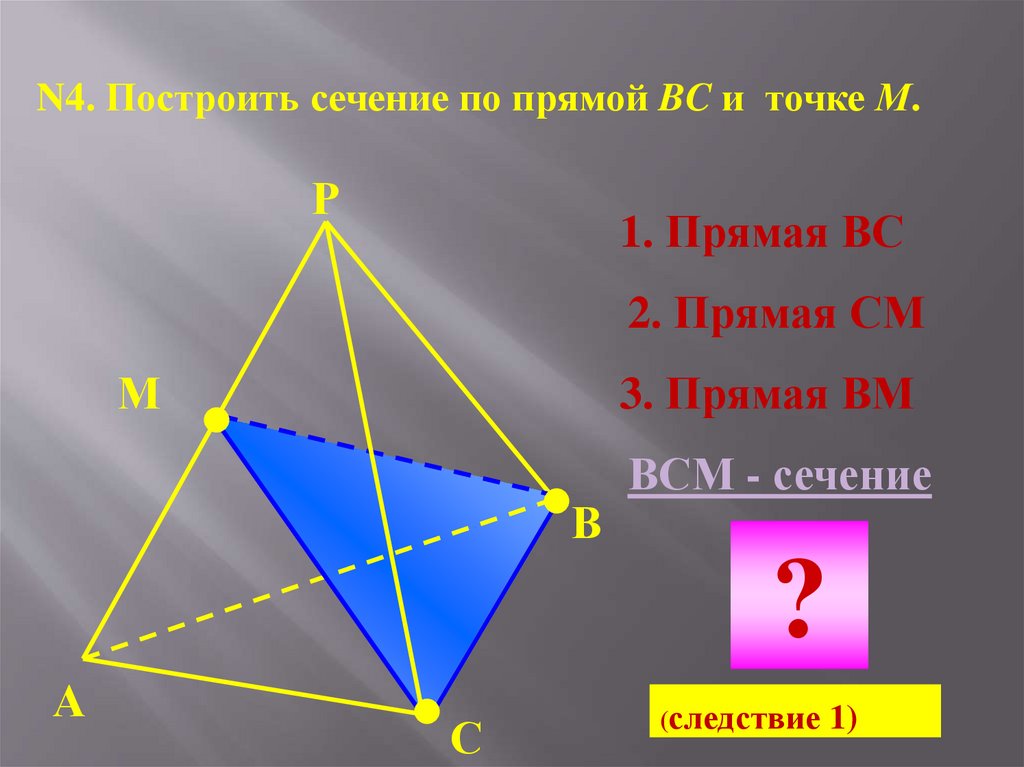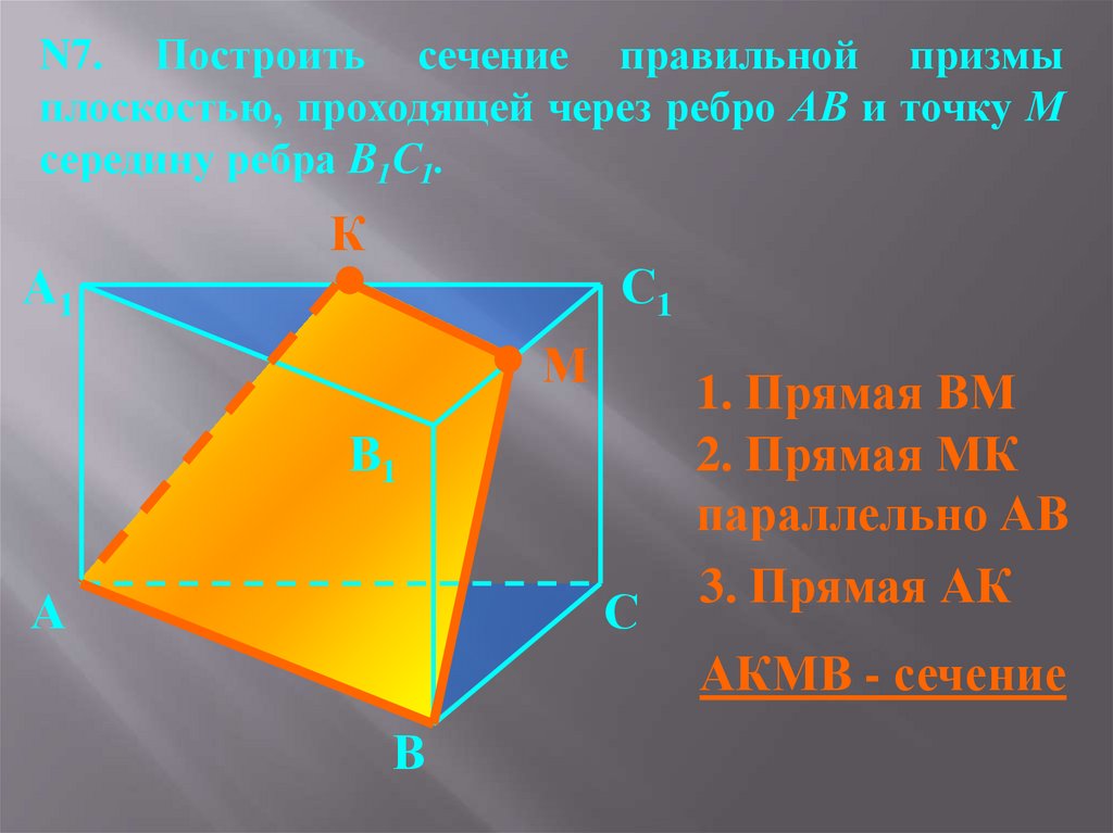 N7. Построить сечение правильной призмыплоскостью, проходящей через ребро АВ и точку М