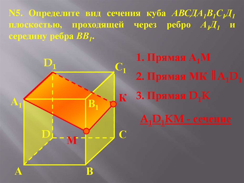 N5. Определите вид сечения куба АВСДА1В1С1Д1плоскостью, проходящей через ребро А1Д1 и